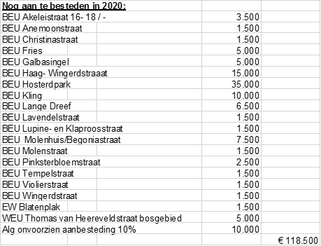 Op dit moment is in 2020 € 92.000 besteed. Van het totale budget (3 jaar samen) van € 496.000 resteert dus nu nog € 404.000. De voorgenomen bestemming van deze middelen is als volgt: