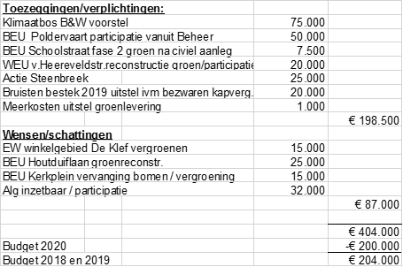De restantbudgetten van het groenamendement (€ 200.000 structureel) van 2018 en 2019 waren toegevoegd aan de reserve budgetoverheveling (€ 296.000). In 2020 is wederom € 200.000 beschikbaar. Dit is eigenlijk als incidenteel aan te merken, want vanaf 2021 is dit budget structureel ingezet bij het nieuwe groenbestek.